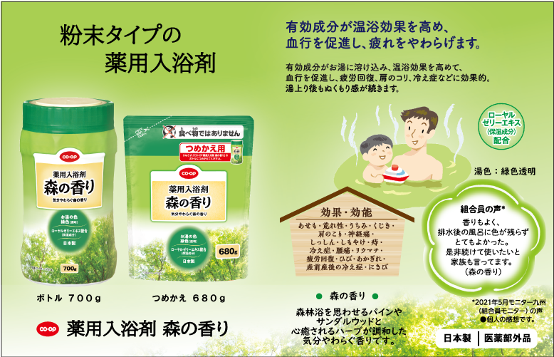 粉末タイプの薬用入浴剤。有効成分が温浴効果を高めて血行促進。湯上り後もぬくもり感持続。ローヤルゼリーエキス(保湿成分)配合。医薬部外品。気分やわらぐ森の香り(湯色:緑色透明)。