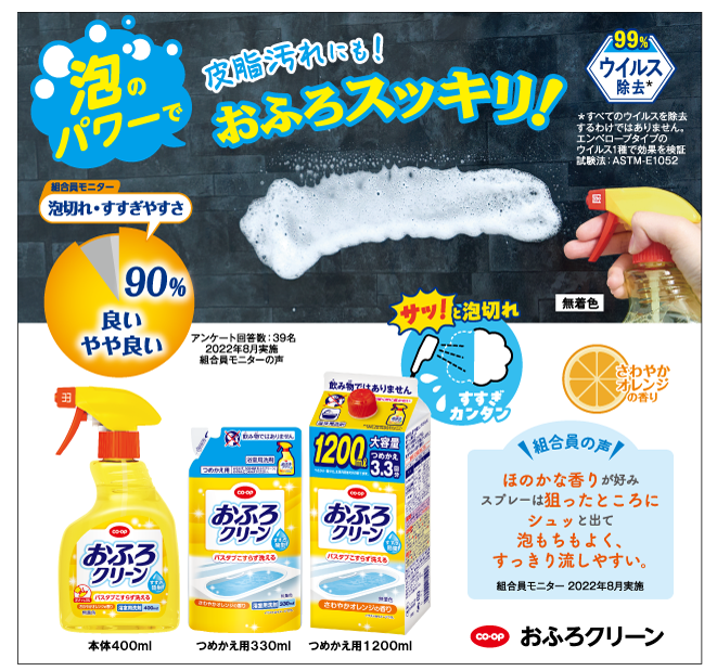 泡スプレータイプの浴室用洗剤。シュッとねらえる泡で、皮脂汚れもスッキリ。バスタブこすらず洗える。逆さでもスプレーOK!さわやかなオレンジの香り、無着色。ウイルス除去にも(*)