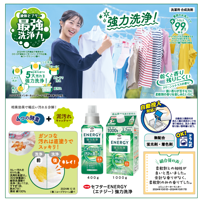濃縮洗たく用洗剤。4種の酵素配合。繊維の奥まで浸透して皮脂汚れ、食べ物のシミを分解洗浄!ウィルス99%除去(試験法:ASTMーE1052)。 乾いた衣類に残りにくいクリーンシトラスの香り(微香性)。自動投入対応。蛍光剤・着色剤無配合。
