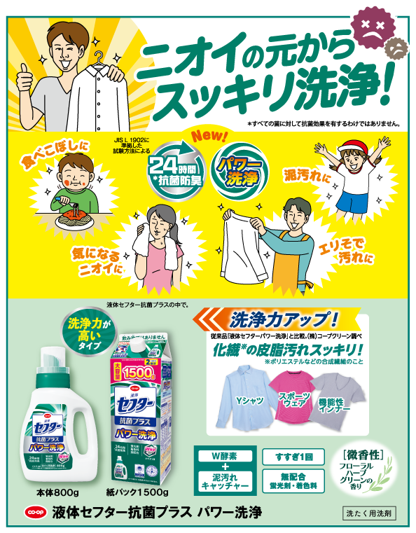 えり・そでの皮脂汚れから、ニオイ汚れ、泥、食べこぼし汚れまでパワー洗浄!
