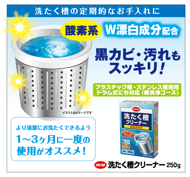 酸素系粉末タイプの洗たく槽クリーナー。黒カビ・汚れもスッキリ!W漂白成分で洗たく槽が簡単きれい!プラスチック槽・ステンレス槽両用、ドラム式(槽洗浄コース)にも対応。
