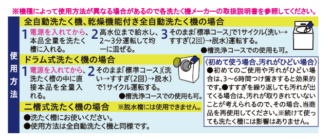 塩素系の液体タイプの洗たく槽クリーナーです。カビ・汚れスッキリ。つけおきいらず。ステンレス槽・プラスチック槽、両用。ドラム式にもOK。