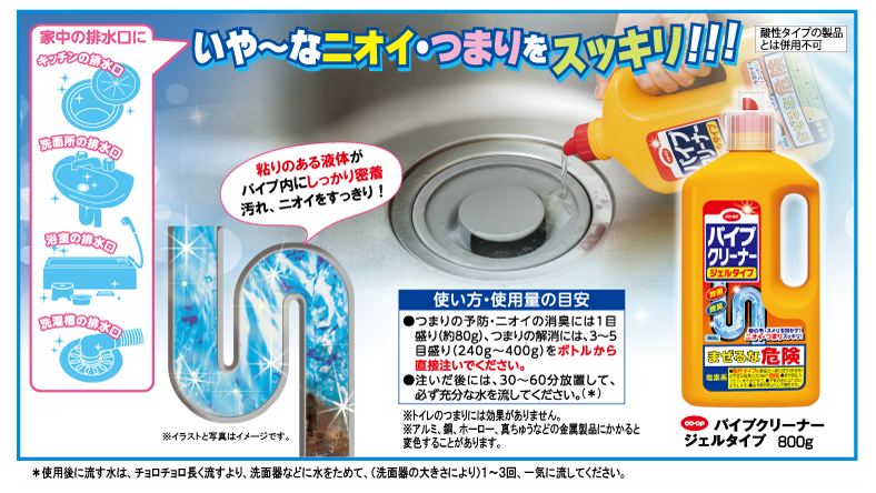 粘りのある液体がパイプ内にしっかり密着、髪の毛、油の詰まりをしっかり溶かし、臭いのもとをすっきり洗浄します。計量しやすい目盛り付き。